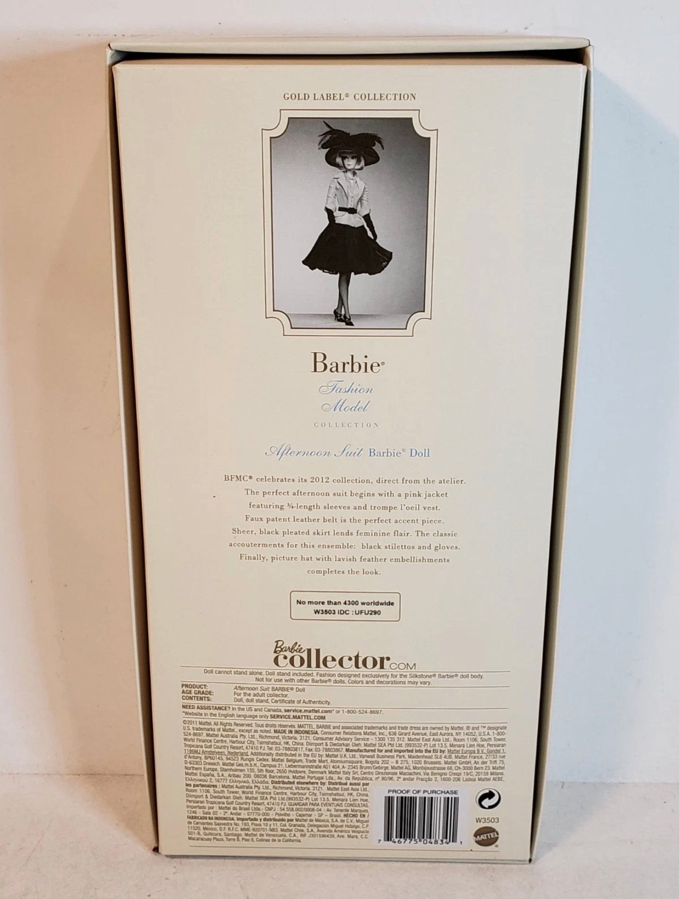 The perfect afternoon suit begins with a pink jacket featuring ¾ length sleeves and trompe l'oeil vest. Faux patent leather belt is the perfect accent piece. Sheer black pleated skirt lends feminine flair. The classic accouterments for this ensemble: black stilettos and gloves. Finally, the picture hat with lavish feather embellishments completes the look!