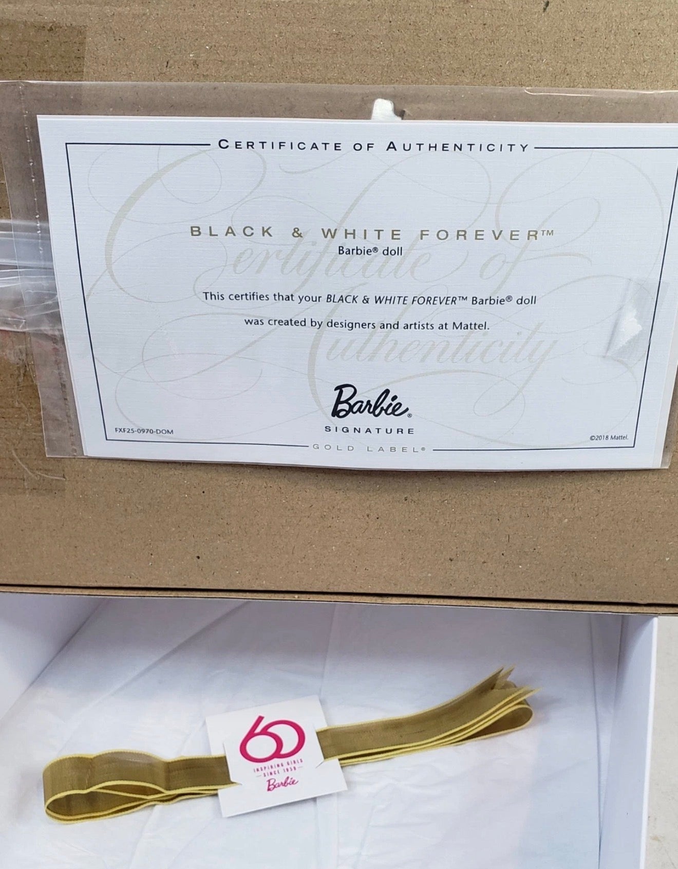 The Barbie® Fashion Model Collection (BFMC® ) celebrates the timeless elegance of classic couture from the past and adds a contemporary twist. Commemorating her 60th anniversary, Barbie doll exudes sophisticated glamour in a floor-length satin ball gown, inspired by the iconic black and white swimsuit. Two luxurious satin bows adorn the beautiful back, revealing a full black net petticoat. Satin opera gloves, rhinestone and faux pearl drop earrings and an elegant, platinum up-do featuring jet-black streaks finish this bold look. This BFMC® collection doll is truly the perfect tribute to the doll that started it all. This collectible BarbieBarbie doll features a beautiful vintage face sculpt and a Silkstone® body for endless posing possibilities. Subject to availability. Colors and decorations may vary