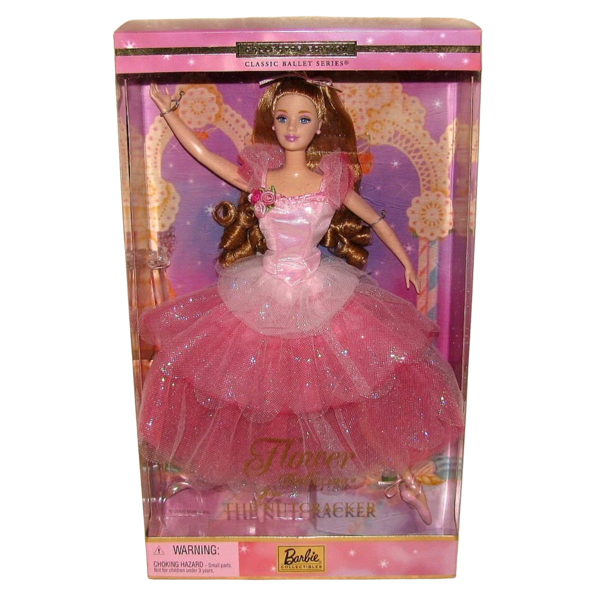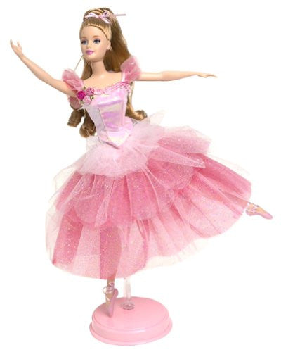 Celebrate “The Nutcracker” with Barbie® doll as Flower Ballerina™. Barbie® is delicately draped in multi-layers of glittering pink and rose tulle, complemented by a pink satin bodice with a sweet cluster of pink roses. Long flowing curls and pink toe shoes complete her most delicate look. Barbie® doll as Flower Ballerina™ even has specially designed legs that allow you to pose her in “on-toe” ballet positions!