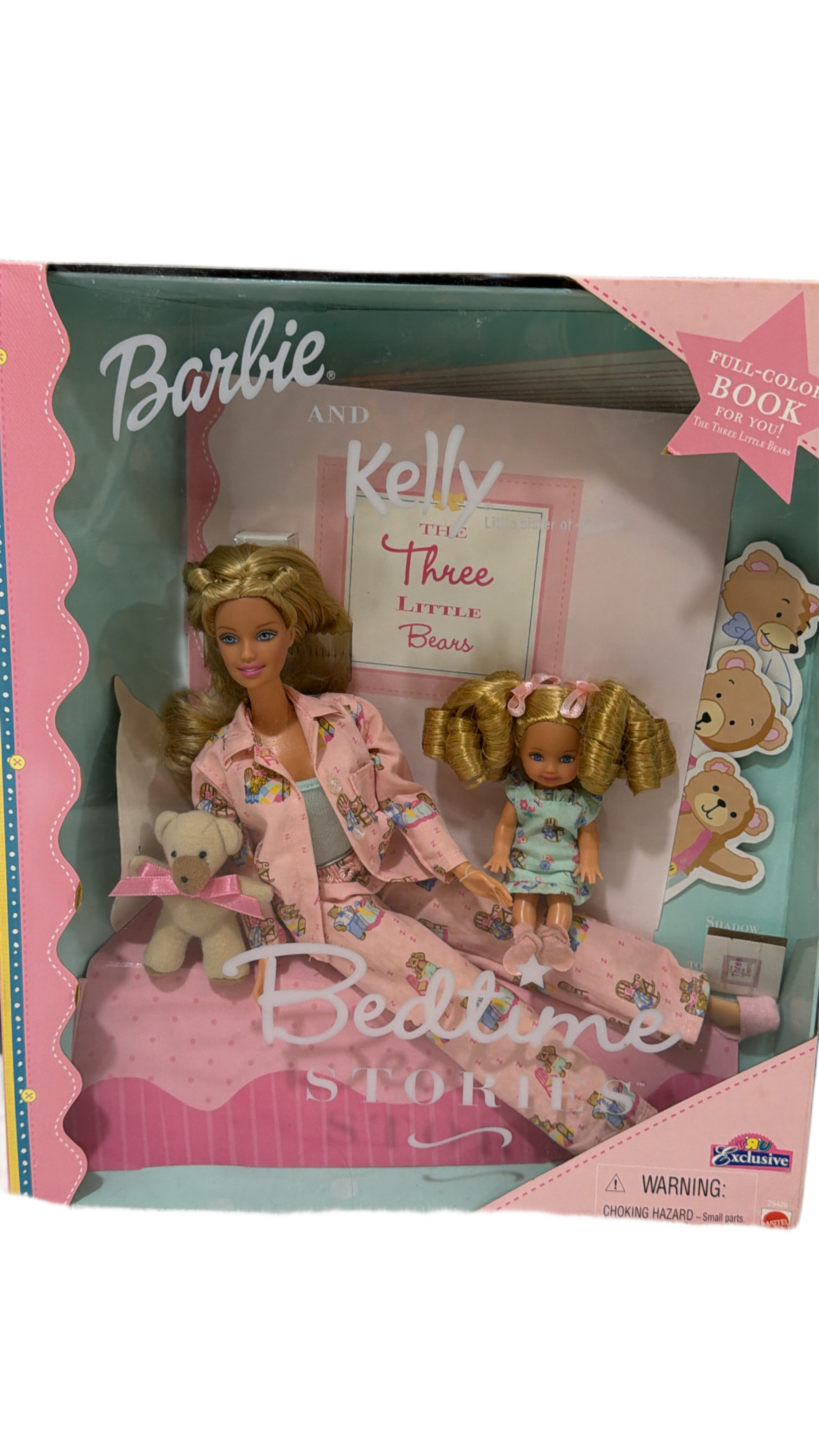 Big sister Barbie proves to be an excellent older sister to Kelly by reading her a children's classic--The Three Bears--at bedtime. Barbie has long blonde hair, bends and twists at the waist, and can extend her arm in a nearly perpendicular angle from her side. Pretty neat. She's outfitted in cozy pink cotton pajamas, decorated with a bear pattern, and Kelly is nicely detailed with an aqua nightshirt, pink slippers with bear faces, and oversize sausage curls in her hair. They come with a small teddy bear and a brush. To make this gift set extra special, a Golden Book edition of The Three Bears is included--in case the real big sister of the family is inspired to read to her little sister.