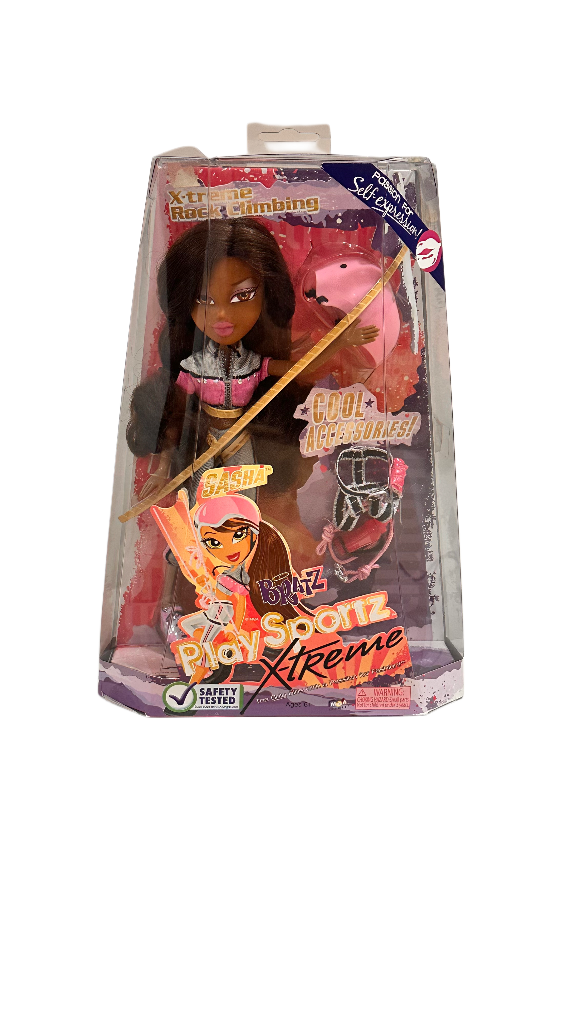 The Bratz Play Sportz X-treme Rock Climbing Sasha doll, released in 2008, features Sasha dressed in sporty attire suitable for rock climbing. She comes with various accessories related to the sport, as part of the larger Play Sportz collection where each doll is themed around a different sport.