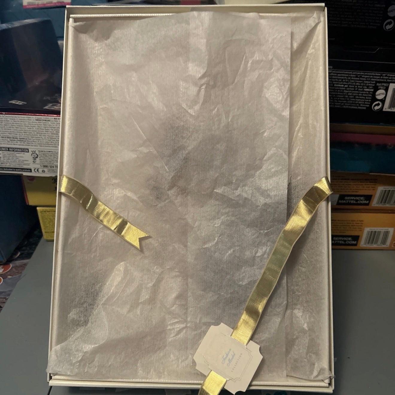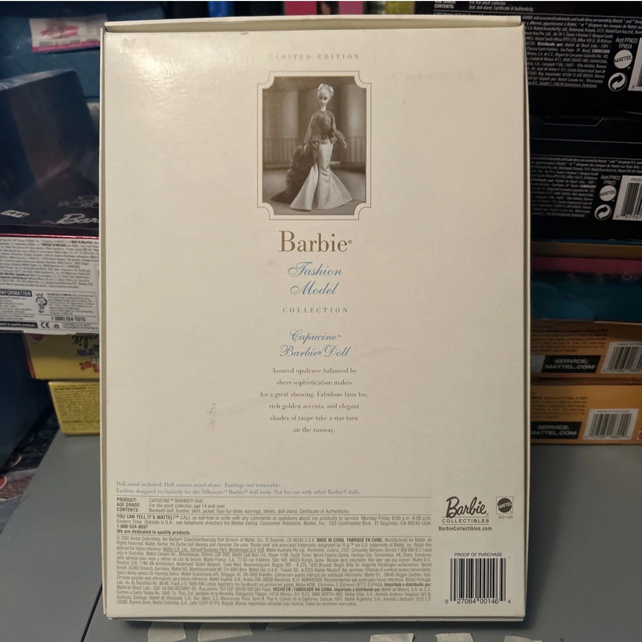 Capucine™ Barbie® doll radiates opulence balanced by sheer sophistication. She is dressed in a creamy cappuccino-colored evening ensemble consisting of a strapless taffeta bustier and mermaid skirt. A taupe organza evening jacket embroidered with golden sequins and lace trim highlights this dazzling mix. A luxurious chocolate brown faux fur stole adds richness. Golden and rhinestone drop earrings play beautifully against her platinum blonde hair styled in an intricate evening chignon.