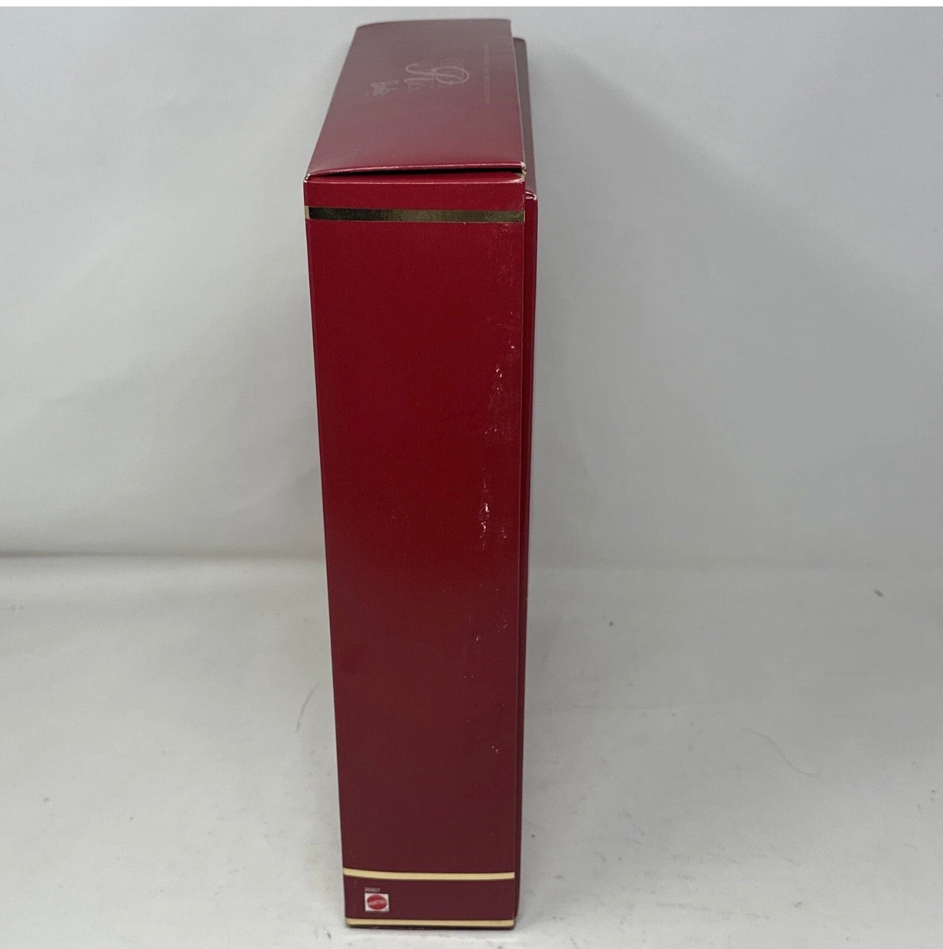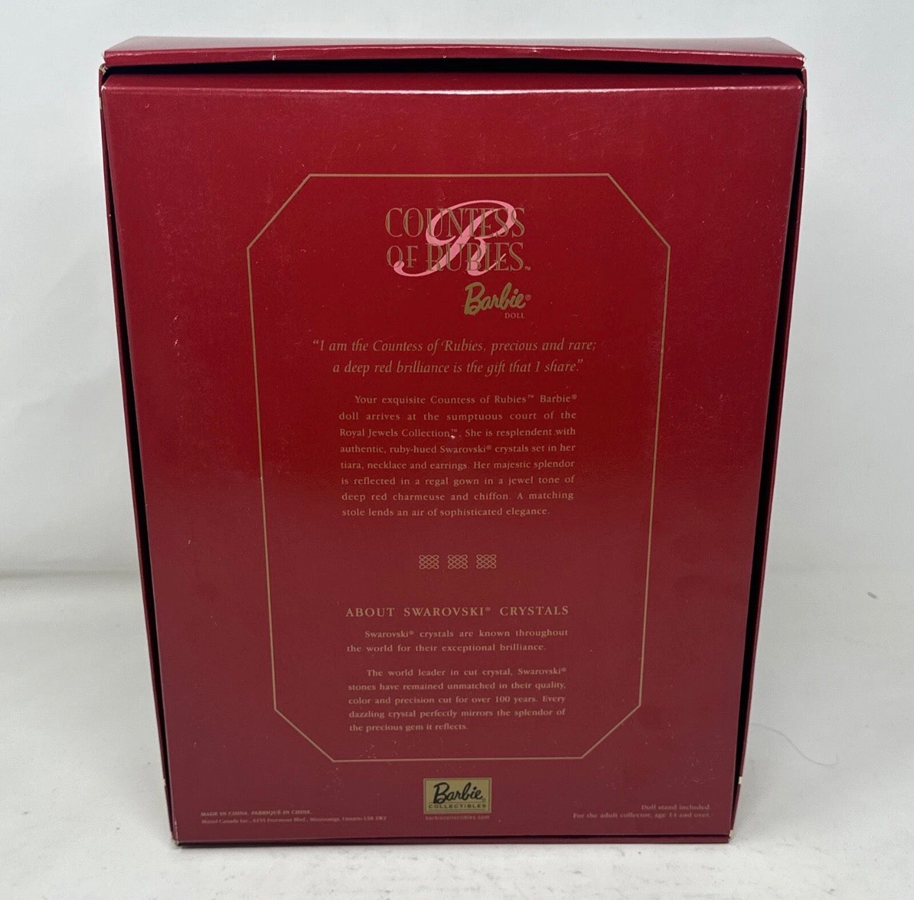 Inspired by the elegance of rubies, Barbie® doll wears a luxurious gown of deep red charmeuse and chiffon. A matching stole lends an air of sophisticated elegance. She is resplendent with authentic, ruby-hued Swarovski® crystals set in her tiara, necklace and earrings.