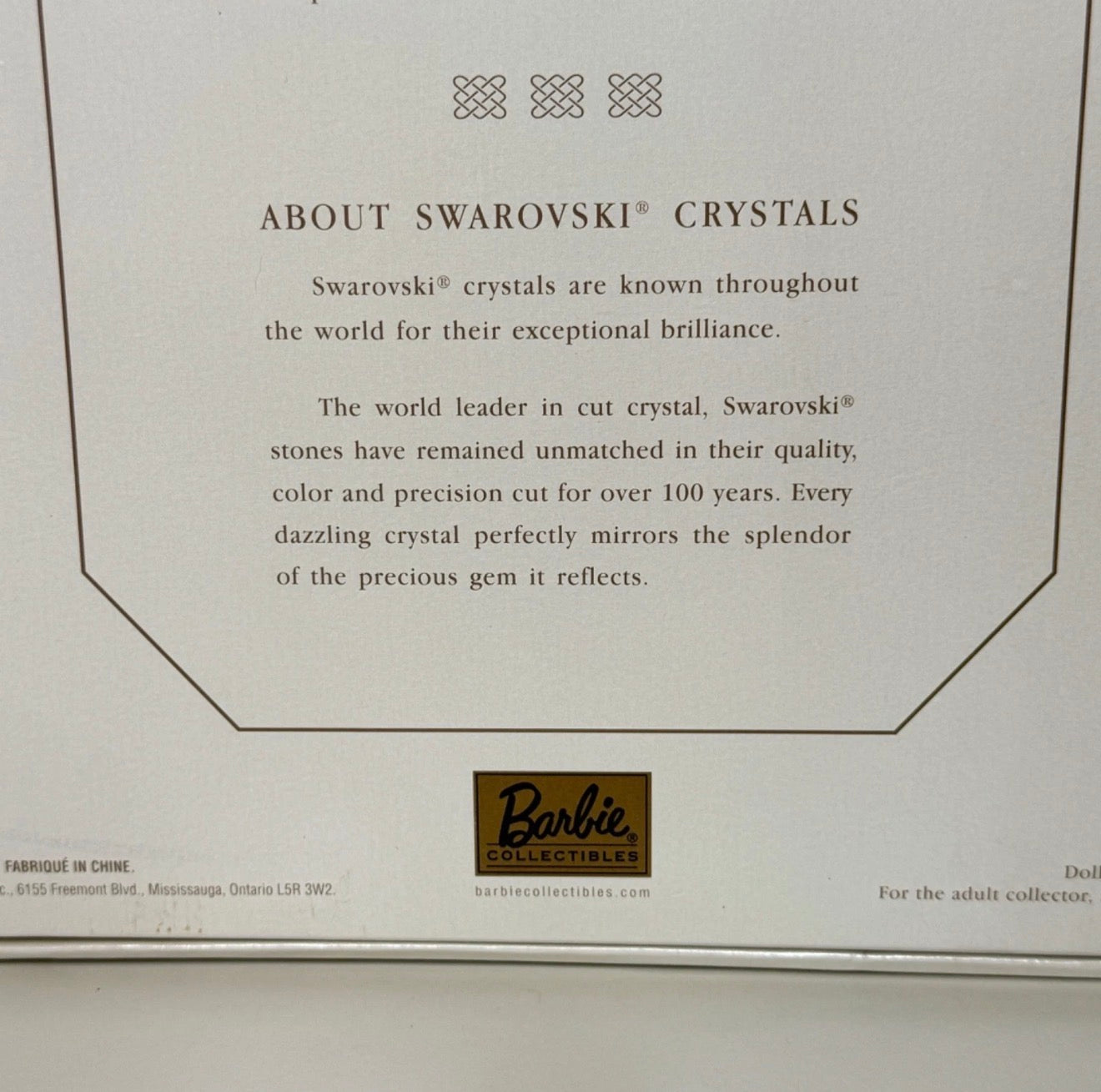 Duchess of Diamonds™ Barbie® doll joins regal company in the acclaimed Royal Jewels Collection™. She shimmers with authentic Swarovski® crystals — clear and sparkling — exquisitely set in her tiara, necklace, and earrings. Her long evening dress, in a pearly shade of white charmeuse, is complemented by a matching off-white chiffon stole, which elegantly completes the opulent ensemble.