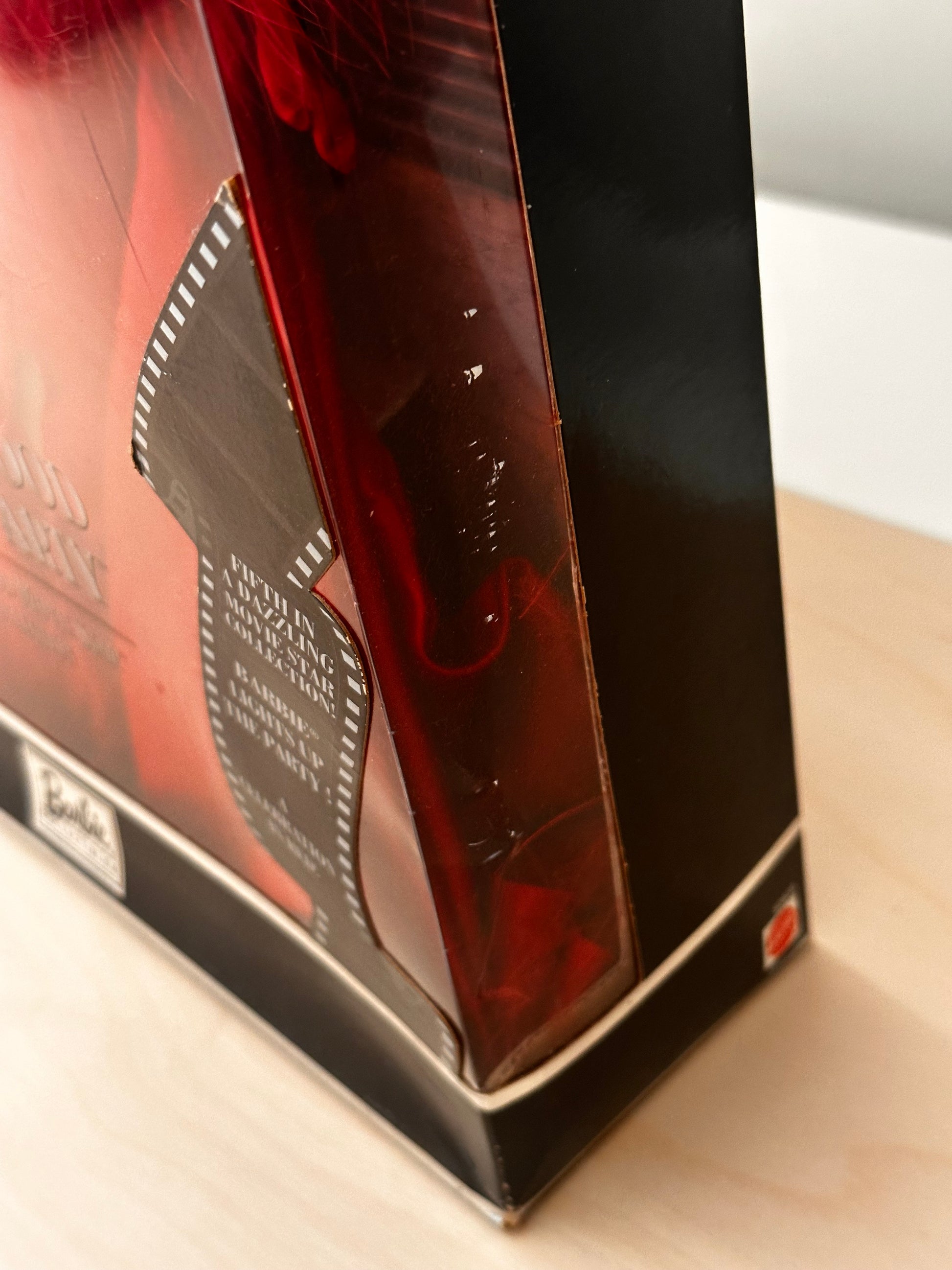 Fifth in the Hollywood Movie Star™ collection, Barbie® doll is ready to celebrate the season at a glamorous holiday party. Barbie® doll exudes glamour and sophistication in a head-turning holiday ensemble. She wears a stunning red charmeuse gown that falls gracefully to the floor, accented with a matching red belt with golden buckle. Around her shoulders, her red marabou shrug shimmers with golden threads. Completing her ensemble are red gloves, a golden and rhinestone necklace and golden earrings.