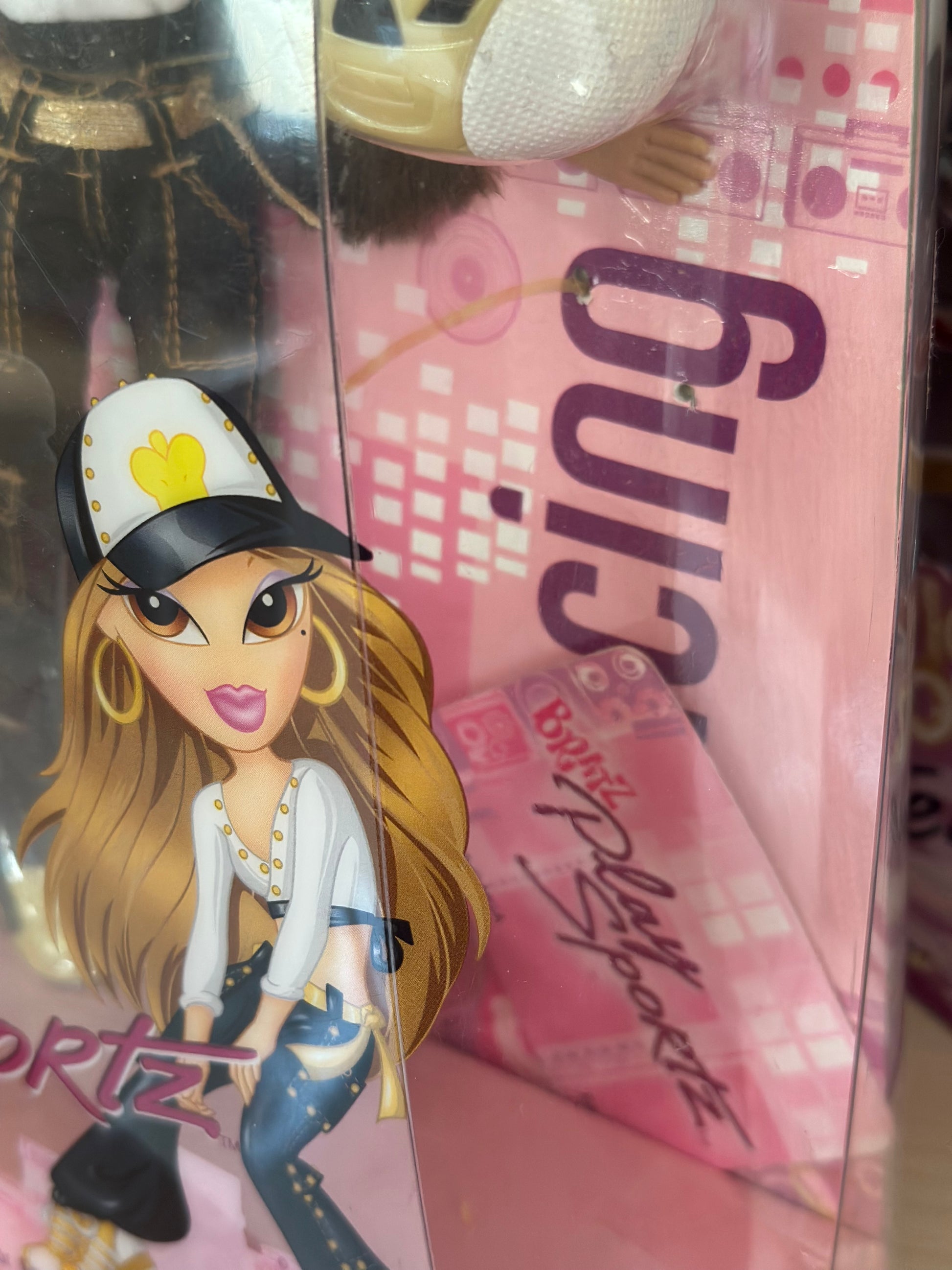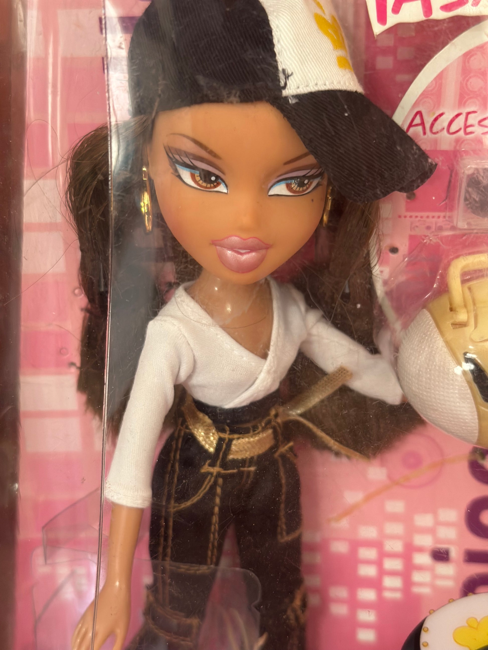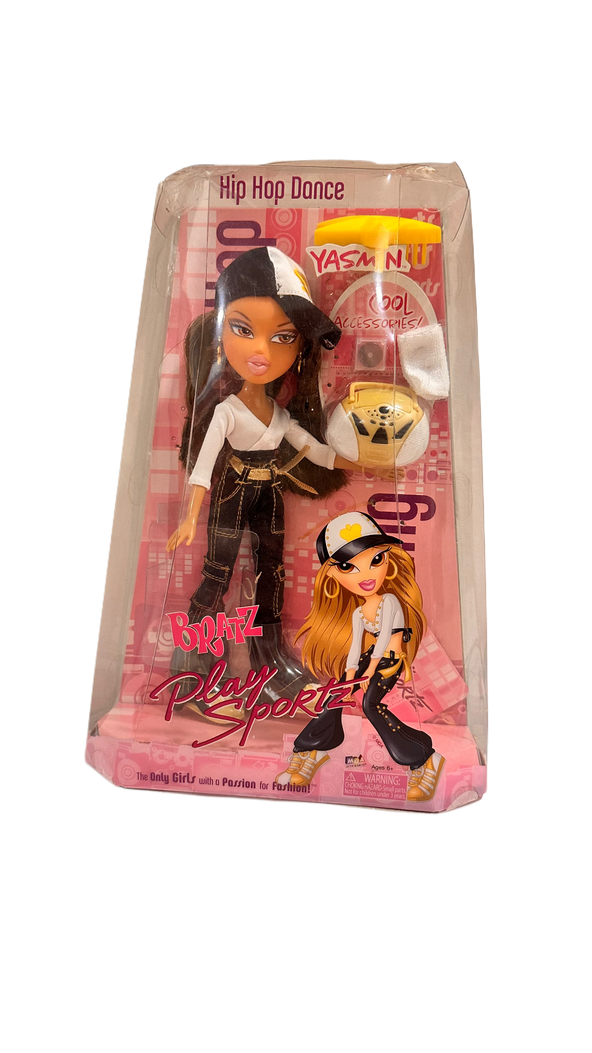 The Bratz Play Sportz Hip Hop Dance featuring Yasmin in a trendy hip hop outfit with a pink and purple top, denim-inspired shorts, matching sneakers, sunglasses, and a hat. She is designed to be fully posable for dynamic dance poses and includes accessories like a microphone and speakers, allowing for creative play.