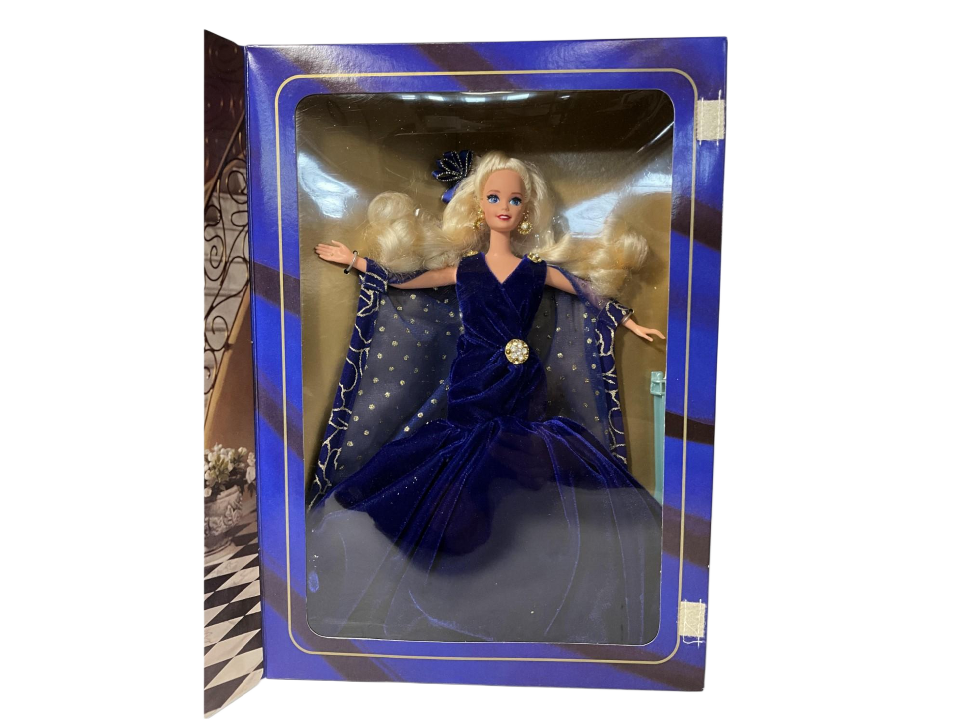 Barbie® doll will surely take your breath away in this fabulous blue ensemble! Wearing a simple yet elegant sapphire-blue gown and matching blue wrap with golden accents, this limited edition doll captures the essence of her namesake. Her long blond hair cascades around her shoulders, and is accented by an adorable blue hair ribbon with golden trim. Golden drop earrings and rooted eyelashes complete Barbie® doll's stunning look.