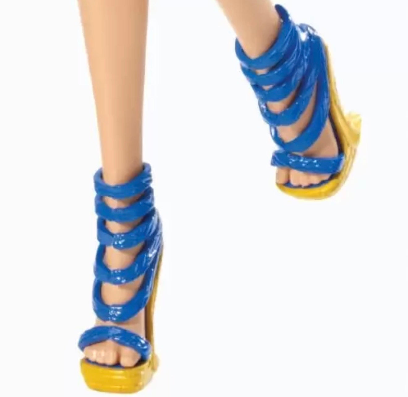 Cleo is magnificent in her Picture Day ensemble. She is wearing a long shirt with a pattern blue bandage wrappings highlighted with black, teal, and shiny gold. Under the top are black & shiny gold striped tights. On her feet are gold wedge sandals with multiple blue straps.