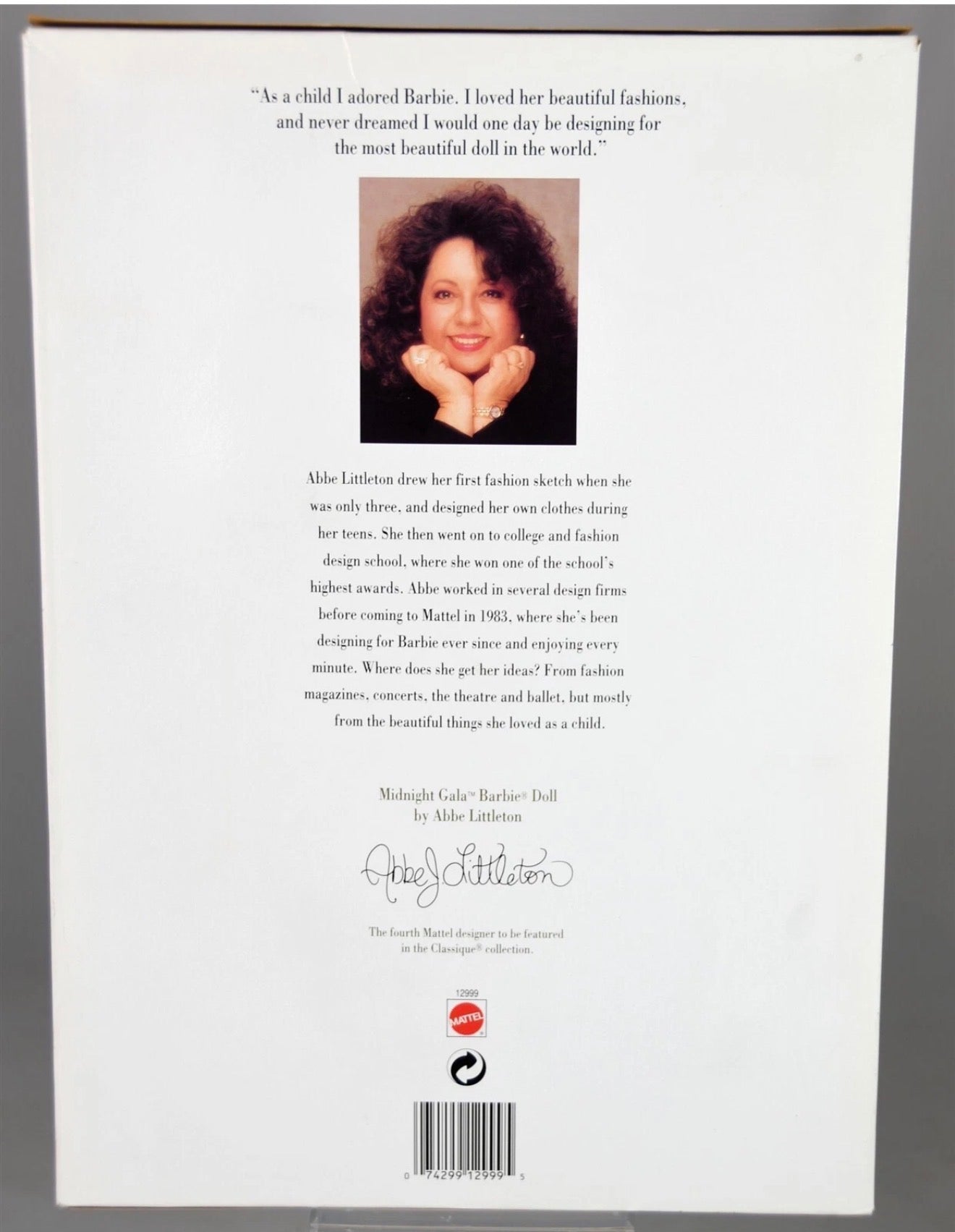 The clock strikes twelve and Barbie® doll makes a grand entrance. Wearing an elegant black velvet gown with gold glitter and rhinestones accenting the bodice, she's certain to turn heads. Her dramatic cape with ornate detailing tops off this truly stunning design. This ultra glamorous Classique® Collection doll was created by veteran Mattel designer Abbe Littleton. From her long golden earrings and jeweled headpiece, to her rooted eyelashes and perfectly placed beauty mark, Barbie® makes this one gala you'll never forget.