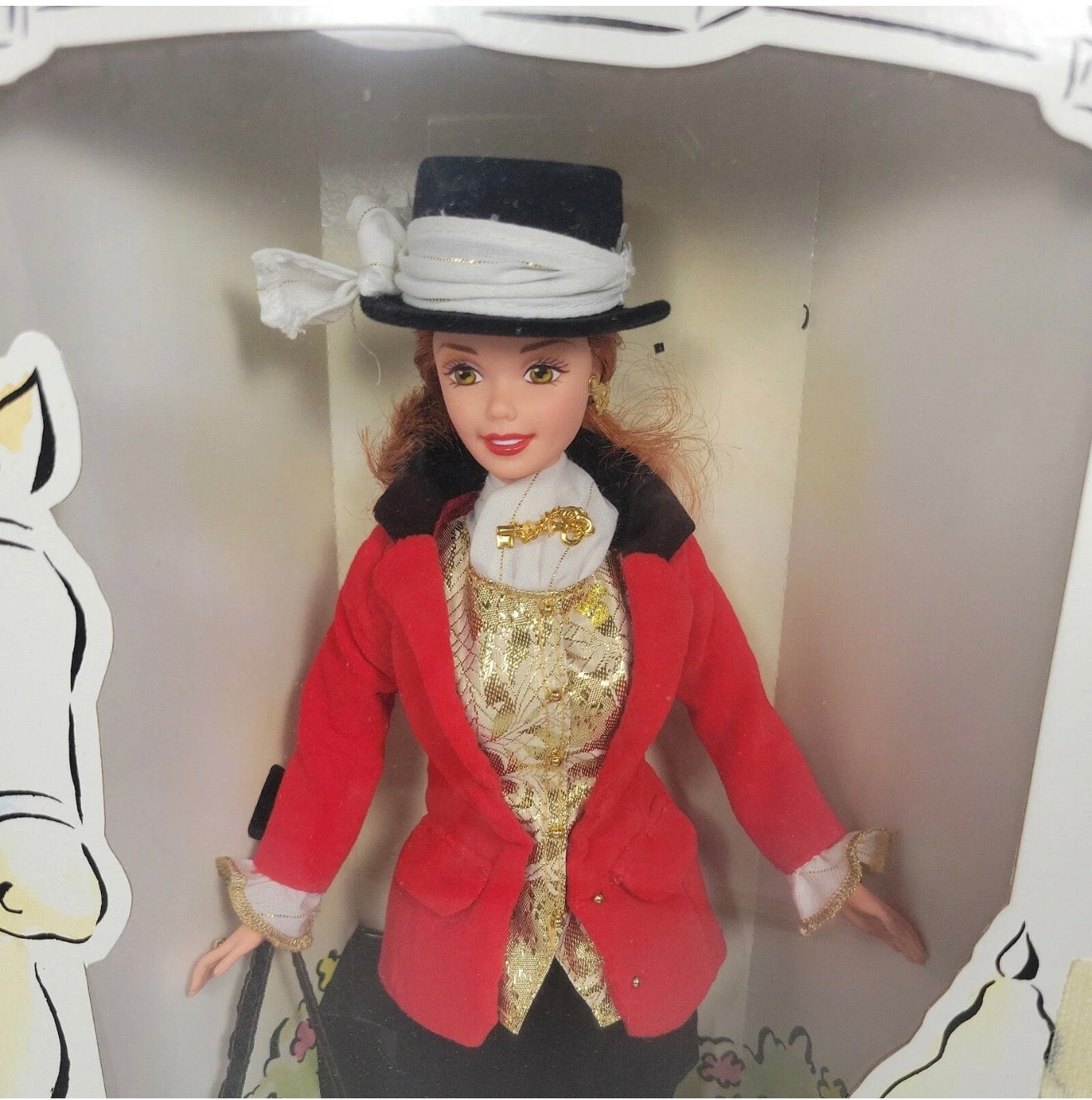 From the rich blue grass at her prize stables, to yet another trip to claim a blue ribbon, Winner's Circle™ Barbie® doll looks fabulous in her equestrian-themed outfit. Barbie® is dressed in a red jacket with black collar and gold tone "buttons." She wears a golden brocade vest and her black bowler hat, boots and shoulder bag complete the outfit. Looking every bit a member of the stylish "horse set," Winner's Circle Barbie® doll is the lucky owner of a famous show jumper, whose skill and flair brings Barbie® to the winner's circle once more.